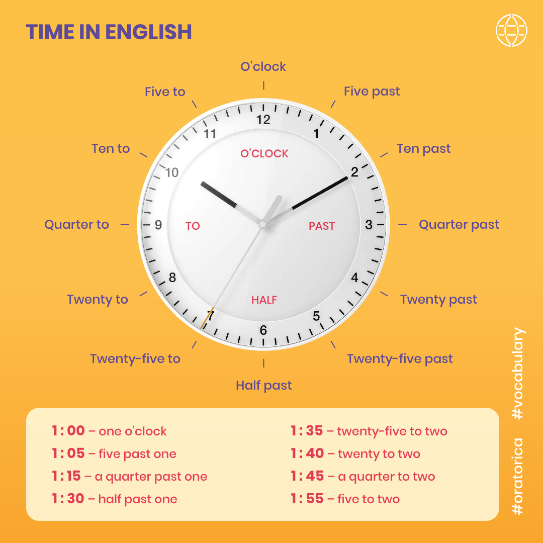 De asemenea, îți recomandăm să studiezi sau să-ți aduci aminte zilele săptămânii în engleză pentru a fi sigur că poți indica timpul în engleză.