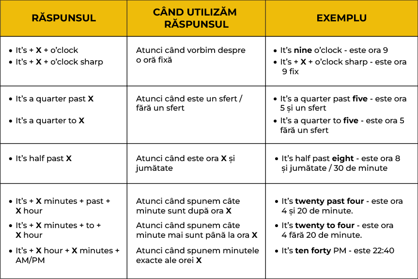 ❗ Este important de menționati faptul că englezii folosesc AM și PM pentru a separa ziua în 2 jumătăți. Astfel, AM sau „ante meridiem” - delimitează orele între 12 noaptea și 12 ziua și PM sau „post meridiem” - delimitează orele între 12 ziua și 12 noaptea.