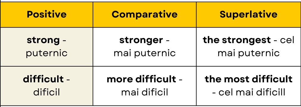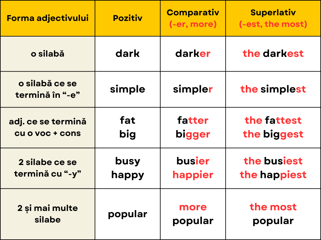 ❗ După cum poți observa, adjectivele la comparativ și superlativ în engleză pot lua forme diferite, în funcție de câte silabe are adjectivul.