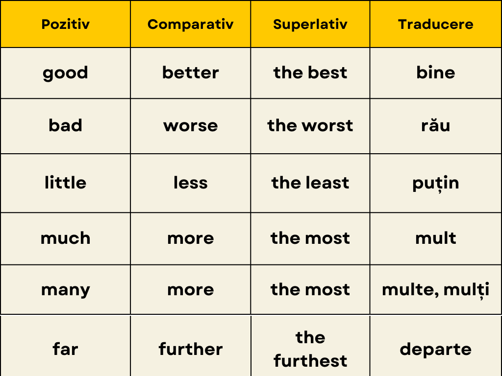 Majoritatea adjectivelor la gradele de comparație comparativ și superlativ în engleză se conduc după regulile indicate în tabel. Dar limba engleză nu ar fi engleză, dacă nu ar avea și câteva adjective care deviază de la regulile scrise. Vestea bună e că adjectivele ce prezintă excepție sunt într-un număr destul de mic, dar care se învață pe de rost, pentru că nu există norme distincte pentru acestea.