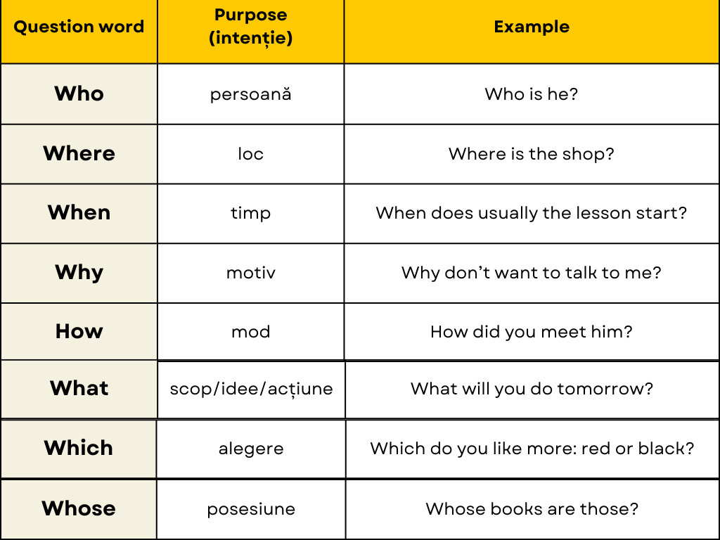 ❗ 1. De obicei, întrebările în engleză încep cu un Question word, care reprezintă întrebările ce solicită detalii: cine, când, cum, unde, de ce, câte, câți, etc. Mai jos, poți vedea tabelul cu Question Words, numite și Wh Questions, pentru că încep cu wh.